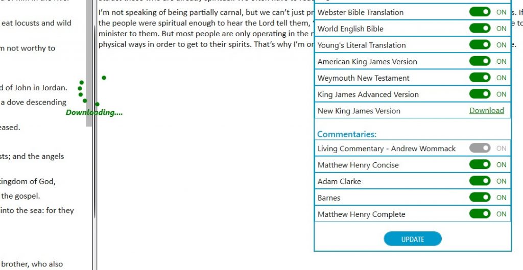 Note: The King James Bible and the Living Commentary are always set in the “On” position and cannot be changed.