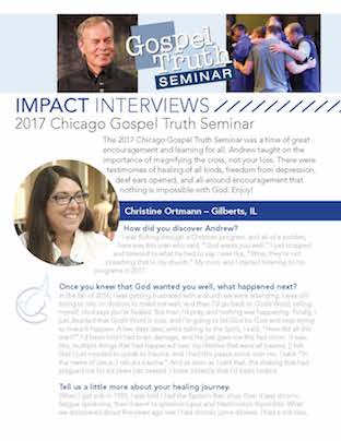 The 2017 Chicago Gospel Truth Seminar was a time of great encouragement and learning for all. Andrew taught on the importance of magnifying the cross, not your loss. There were testimonies of healing of all kinds, freedom from depression, deaf ears opened, and all-around encouragement that nothing is impossible with God. Enjoy!