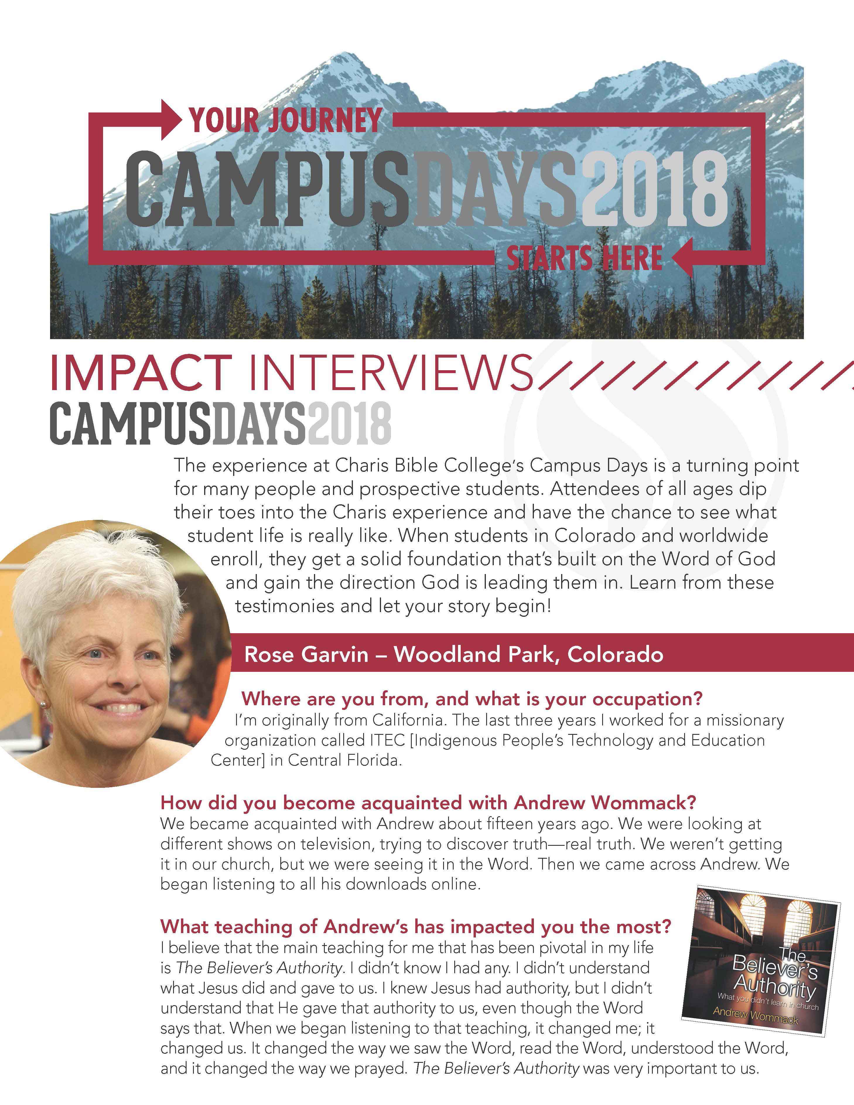 The experience at Charis Bible College’s Campus Days is a turning point for many people and prospective students. Attendees of all ages dip their toes into the Charis experience and have the chance to see what student life is really like. When students in Colorado and worldwide enroll, they get a solid foundation that’s built on the Word of God and gain the direction God is leading them in. Learn from these testimonies and let your story begin!