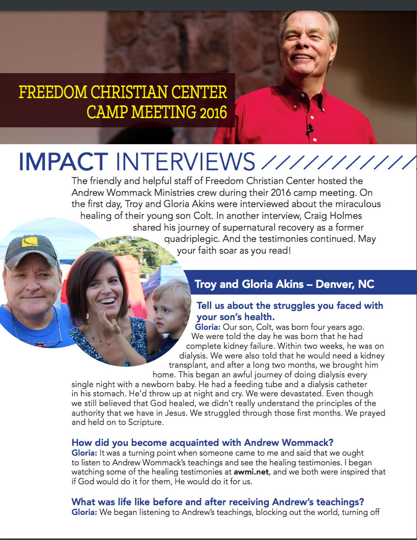 The friendly and helpful staff of Freedom Christian Center hosted the Andrew Wommack Ministries crew during their 2016 camp meeting. On the frst day, Troy and Gloria Akins were interviewed about the miraculous healing of their young son Colt. In another interview, Craig Holmes shared his journey of supernatural recovery as a former quadriplegic. And the testimonies continued. May your faith soar as you read!