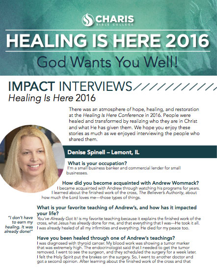 At the 2017 Healing Is Here Conference, we heard testimonies of healings from muscular dystrophy and ovarian cancer. One person received a gracious financial gift from a total stranger during the conference. And a Charis Bible College graduate and her husband inistered healing to a wheelchair-bound attendee from Hong Kong. Only God can do this, and that is why we at Andrew Wommack Ministries and Charis Bible College keep doing what we do!