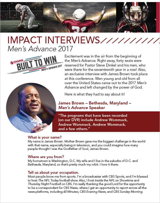 Excitement was in the air from the beginning of the Men’s Advance. Right away, forty seats were reserved for Pastor Steve Dinkel and his men, who were there for the seventeenth year in a row! Also, an exclusive interview with James Brown took place at this conference. Men young and old from all over the United States came out to the 2017 Men’s Advance and left changed by the power of God.