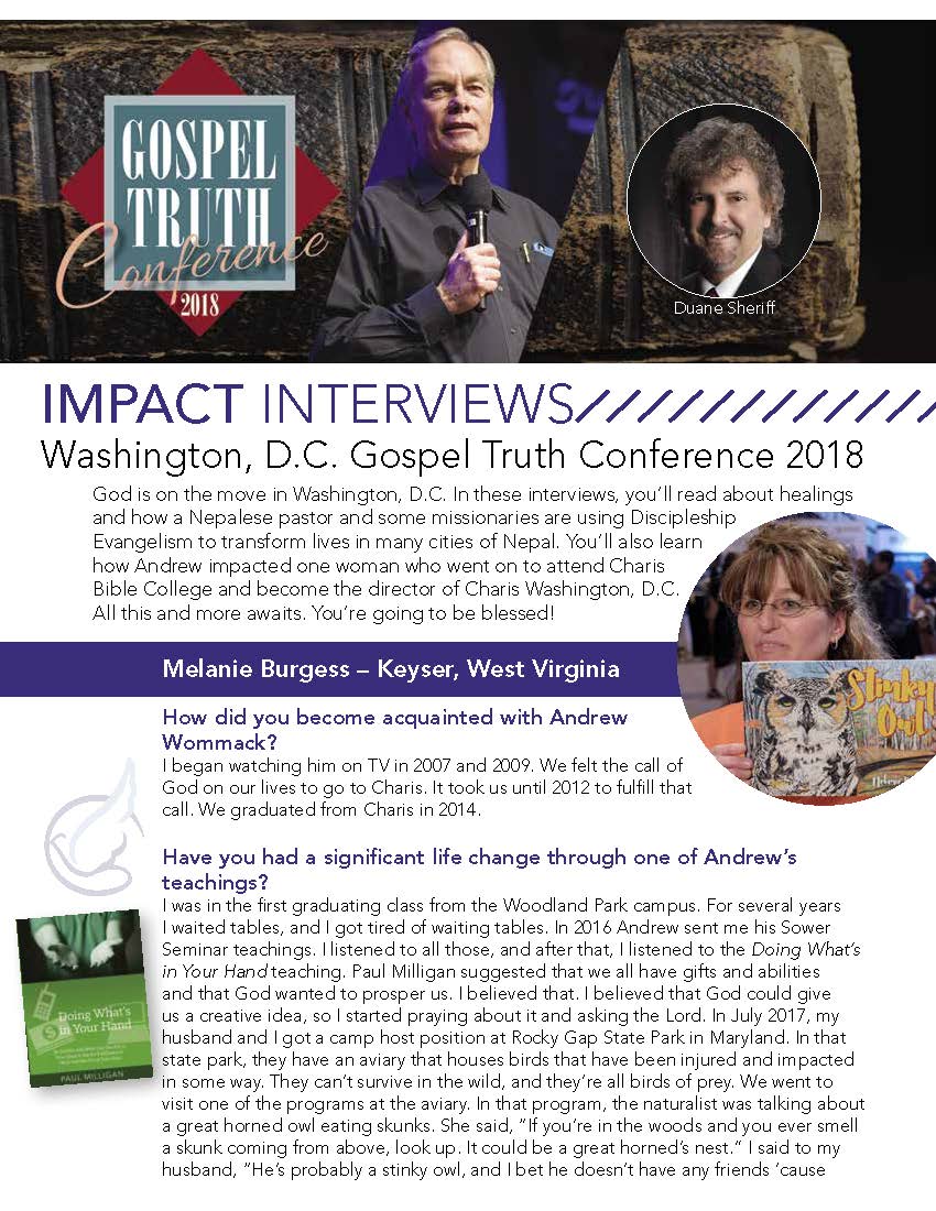 God is on the move in Washington, D.C. In these interviews, you’ll read about healings and how a Nepalese pastor and some missionaries are using Discipleship Evangelism to transform lives in many cities of Nepal. You’ll also learn how Andrew impacted one woman who went on to attend Charis Bible College and become the director of Charis Washington, D.C. All this and more awaits. You’re going to be blessed!